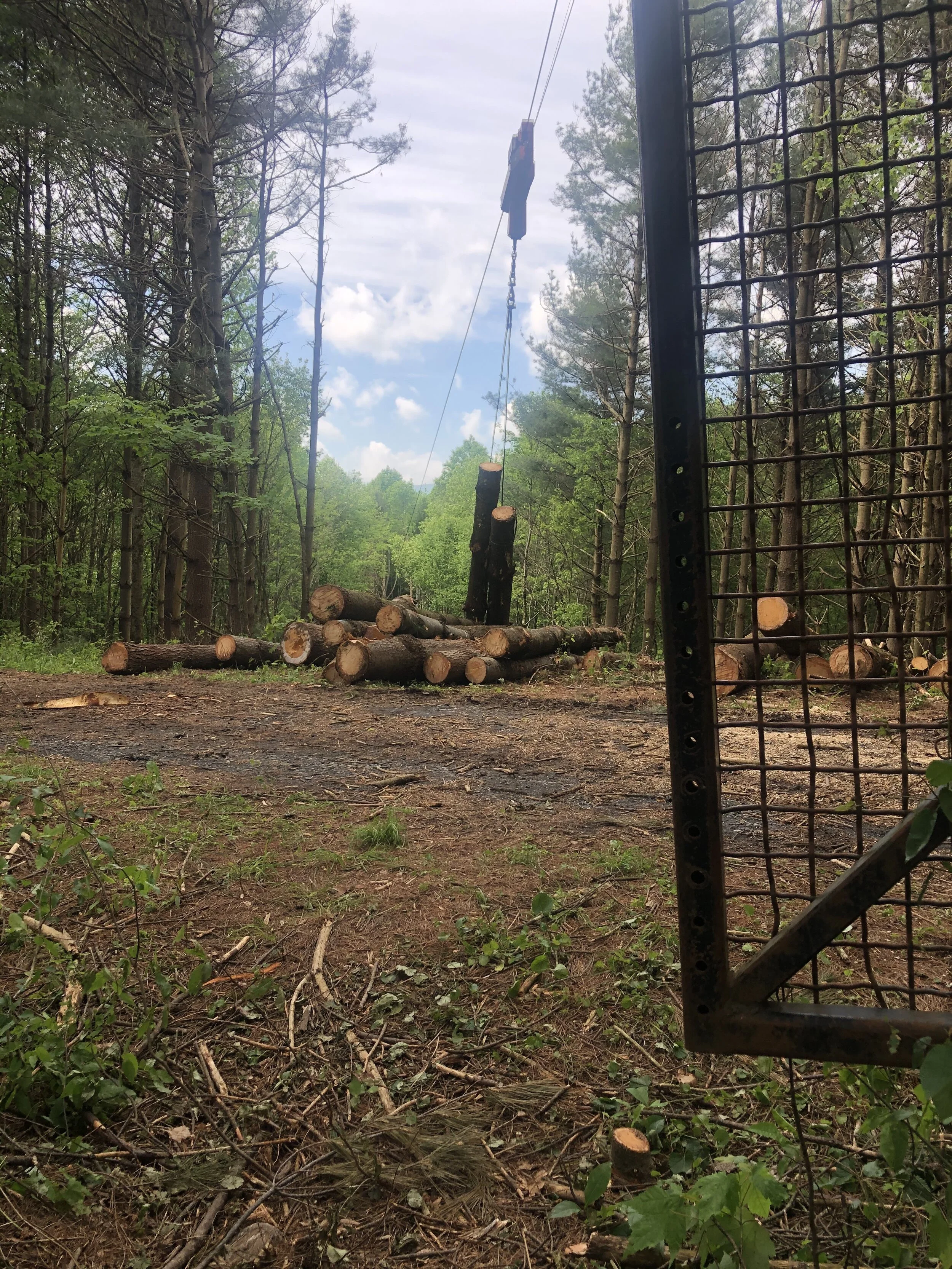 We use a cable system to “fly” logs out of the forest in order to reduce soil impacts and minimize the need for roads. Our cable yarding system allows us to move logs without driving heavy equipment up the mountain side.